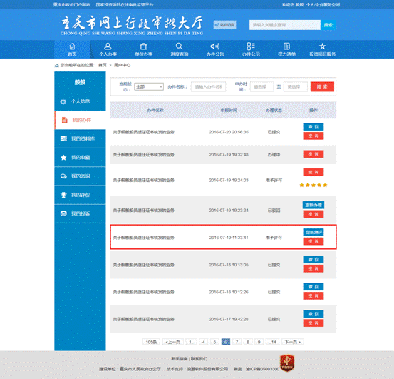 我的办件界面显示用户办件列表,点击业务名称可以查看当前办件的业务详情,对已办结的业务,点击办件名称右侧的【星级测评】按钮可对该业务进行星级评价,如图3.3.1所示: