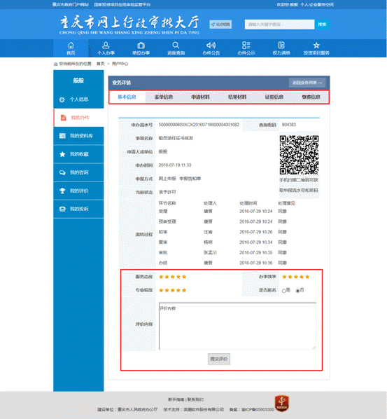 业务详情信息包括办件基本信息、表单信息、申请材料、结果材料、证照信息以及缴费信息,在基本信息标签页中可对已办结的业务进行评价,点选星级、是否匿名、填写评价内容后点击【提交评价】按钮,如图3.3.2所示:
