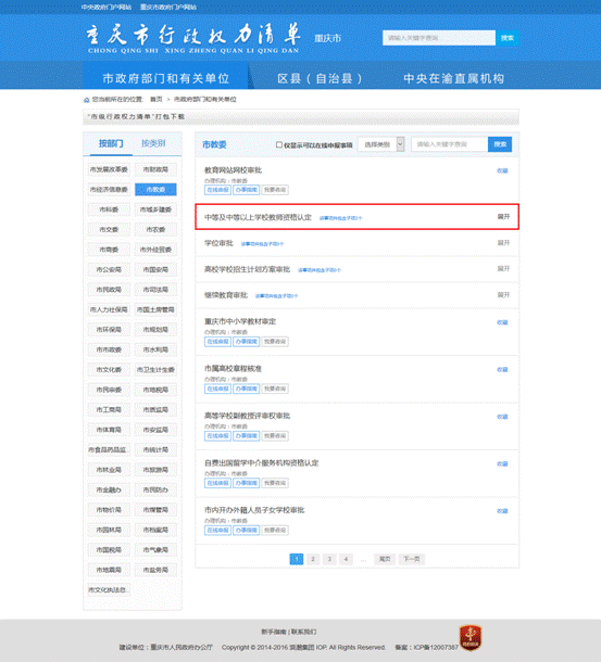 权力清单列表中,【中等及中等以上学校教师资格认定】为父事项,包含两个子事项,点击右侧的【展开】可查看子事项,如图6.2.5所示: