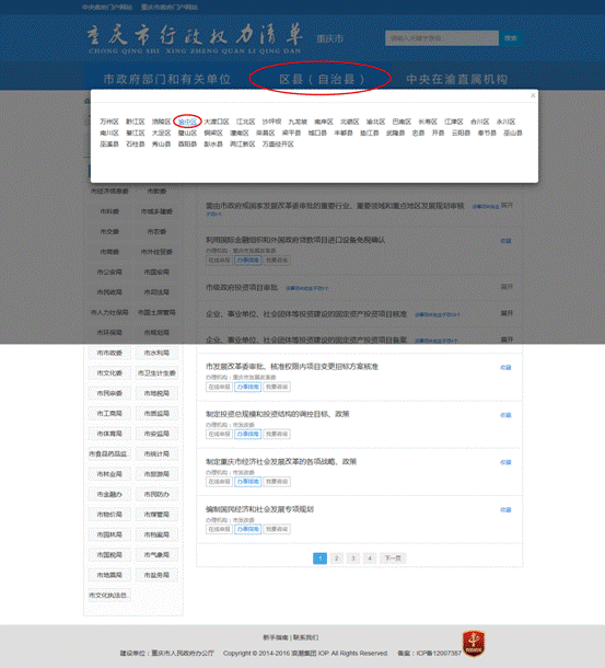 点击【区县(自治县)】弹出窗口选择【渝中区】,可查看渝中区所有的行政权力事项,如图6.2.6所示: