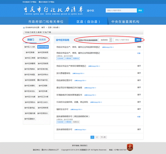 点击选择【渝中区】后,可按照部门和行政权力类型查看所有事项,可以在右侧事项标题栏根据【仅显示可以在线申报事项】、【选择类别】、【选择部门】、【关键字】进行筛选,如图6.2.7所示: